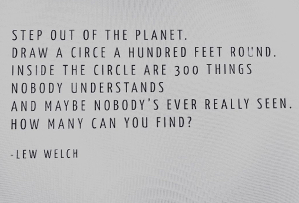 100 Foot Circles is an ongoing site-specific series I recently began in attempt to address the changes/transitions/cycles (historic, social, natural, environmental) of specific land masses around the world. Some of these changes have disrupted the natural energy cycles, permanently harmed interconnected geographical and ecological elements of various landscapes and in many cases eliminated/erased/broke apart communities, cultural histories, and beneficial human and natural systems. This series sprang out of the need to understand and utilize the philosophy and applications of permaculture and to revisit the above poem by Lew Welch.