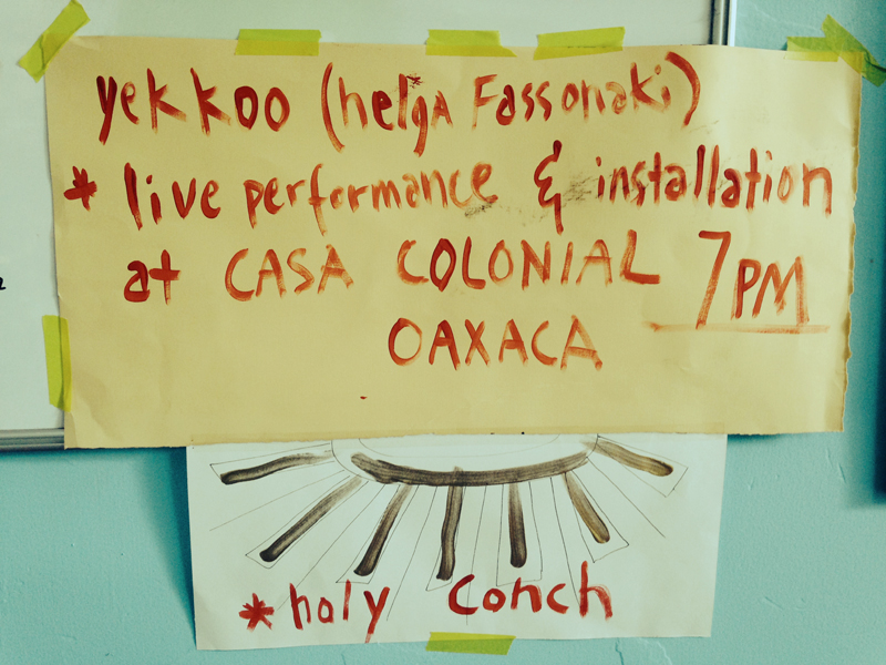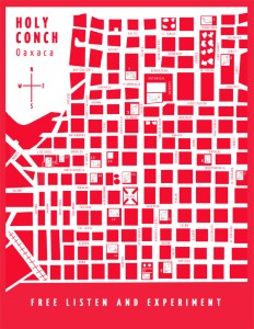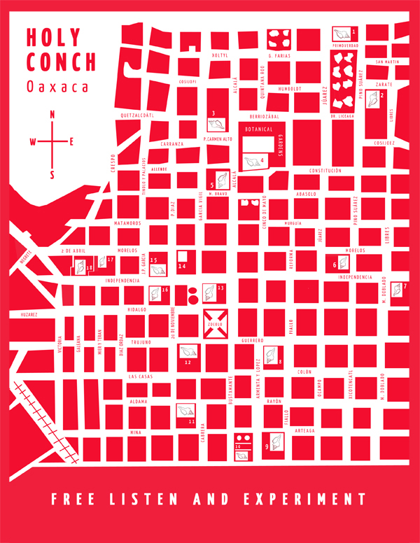 This project was inspired by Akio Suzuki’s ‘Listening Point’ project, Oto-Date, which I had the opportunity to experience under Suzuki and Aki Onda’s instruction during Field Studies 2014 in London. A group of us were given maps and told to find one or more ‘listening spots’ that we later shared with the group. No recorders, no instruments – our tools were our eyes and ears. Our ears like shells brought us closer to an audible landscape. Holy Conch was realized during a residency I did in Oaxaca, Mexico with a similar intention – through the minimal act of listening, allow the senses and mind to peel wide open. Upon arrival to Mexico, I was quickly roused by the many different sights and sounds coming from every direction – It was sensory overload times 100. I couldn’t focus on my intended project nor remain in my studio. I decided I needed to be immersed in the cityscape.