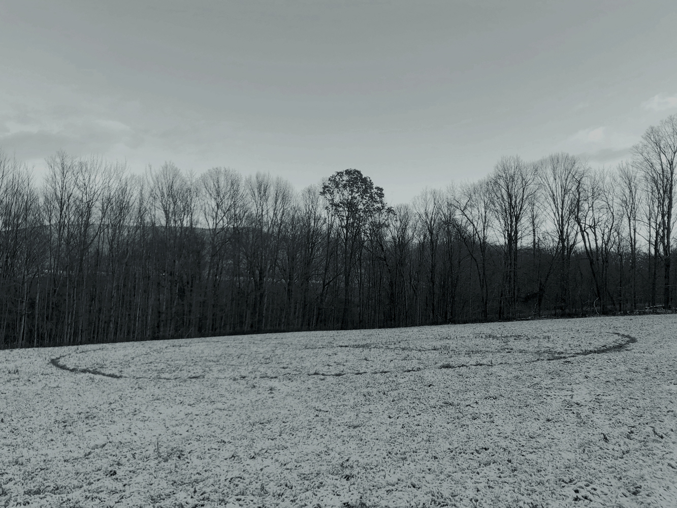 A becoming ritual that required a bit more motivation as fall transitioned into winter far quicker than I had anticipated. My proposed idea was to create a 100’ circle on a found site (part of a series involving the creation of 100 foot circles on different land masses, first ignited by a Lew Welch poem) – this one was going to be created as my observation center, from which I would remain still while listening and witnessing the Fall symphony. However as below freezing temperatures brought snow and a quick change-over, I needed movement. Reading Janet Board’s, “Mazes and Labyrinths of the World” and “Nature Performed: Environment, Culture and Performance”, I began moving and digging, and chasing the snow with lines of dirt and leaves – a labyrinth was emerging.