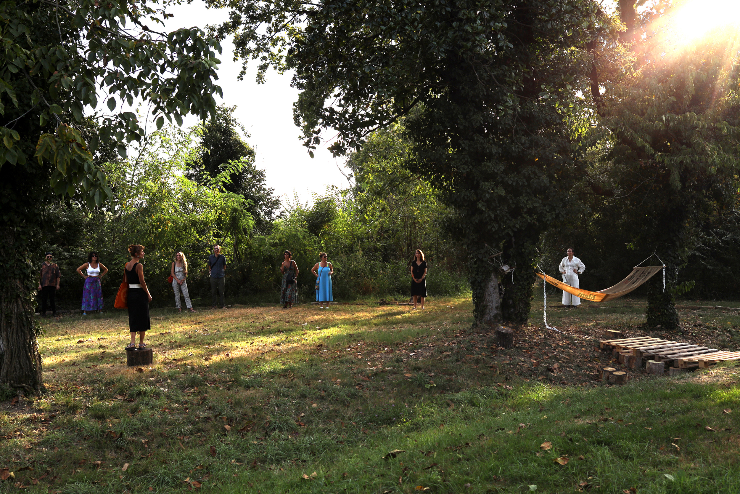 “Circle #6: Make Your Own Field at Cascina Lago Scuro” is part of a series of ongoing 100 foot (33 meters) circles I’ve been making in an attempt to address the changes/transitions/cycles (historic, social, natural, environmental) of specific land masses around the world. The circle series initially began with a Lew Welch poem I reignited as my departure point. It reads: “Step out of the planet. Draw a circle a hundred feet round. Inside the circle are 300 things nobody understands and maybe nobody’s ever really seen. How many can you find?”. Finding 300 things was meant more as a conceptual framework for sitting on the site and deeply observing for hours and days until more sounds, smells, colors, textures, and shapes surfaced, and maybe later they could be identified and classified. Drawn to the idea of circular economy as a way of strengthening threads between people and communities, I wanted to transcribe the soul of Cascina Lago Scuro farm into Circle #6 rather than highlight merely what lay within the circular region. What transpired was only an eye blink of sensations. By engaging in the farm activities as a way to support the farm, I learned new skills and made stimulating connections, like for instance between the tomato sauce we ate that afternoon and the aromatic field where we picked the tomatoes that morning—communicating with body language or through the increase in breaths as the full sun exposed an out pour of sticky pearls running down our foreheads. It was at that moment I envisioned how nice it would be for Ahmed—who manages the gardens and is a key figure in getting ripe tomatoes to the kitchen in time for the chefs to make a cascade of tomato sauce for the many pastas to come—to have access to a hammock nearby for a restorative nap before milking the cows in the early evening and perhaps for the chefs after cooking up an incredible menu or for formaggio master Fabio when he needs a break from turning milk into Gorgonzola.